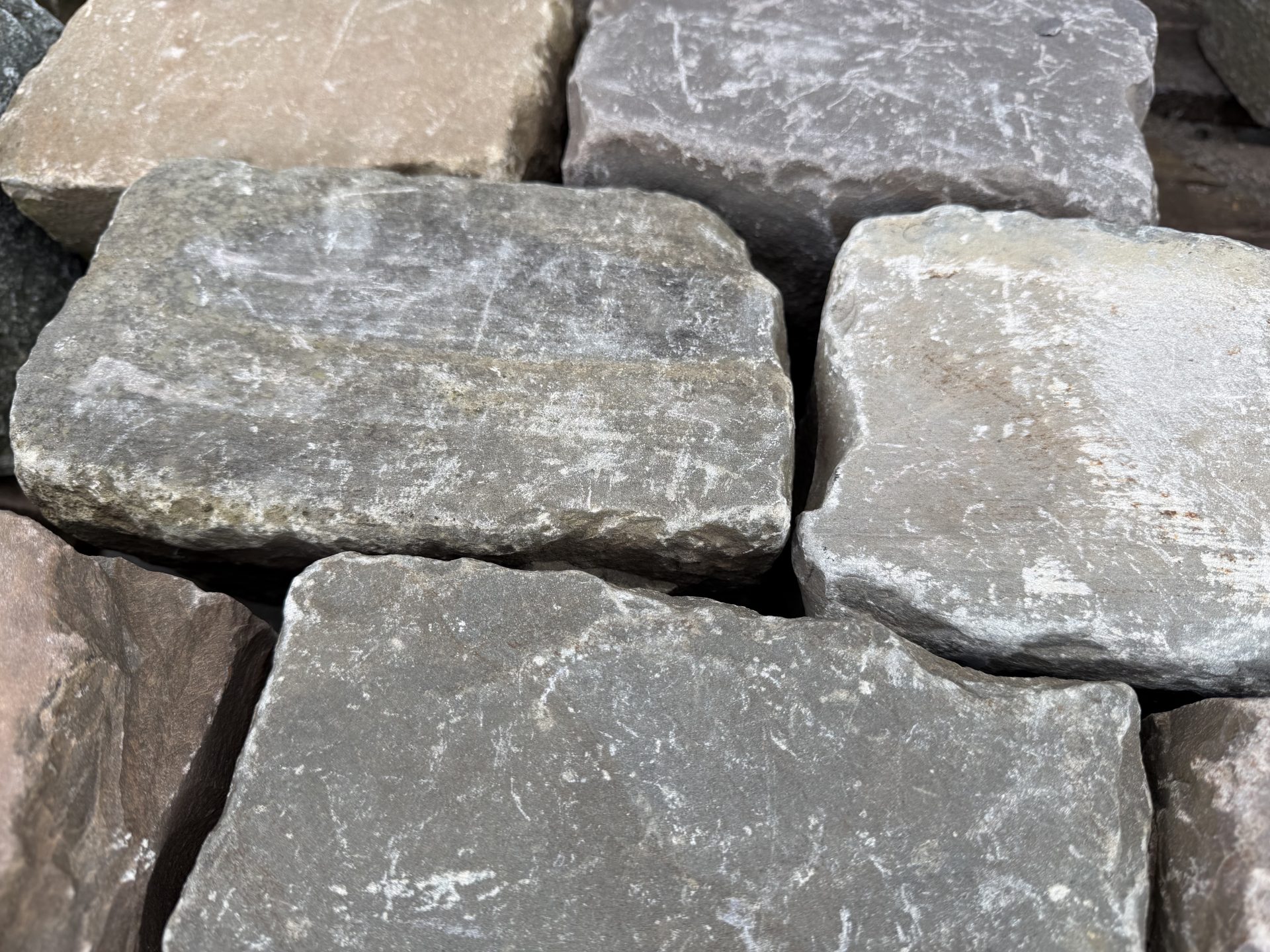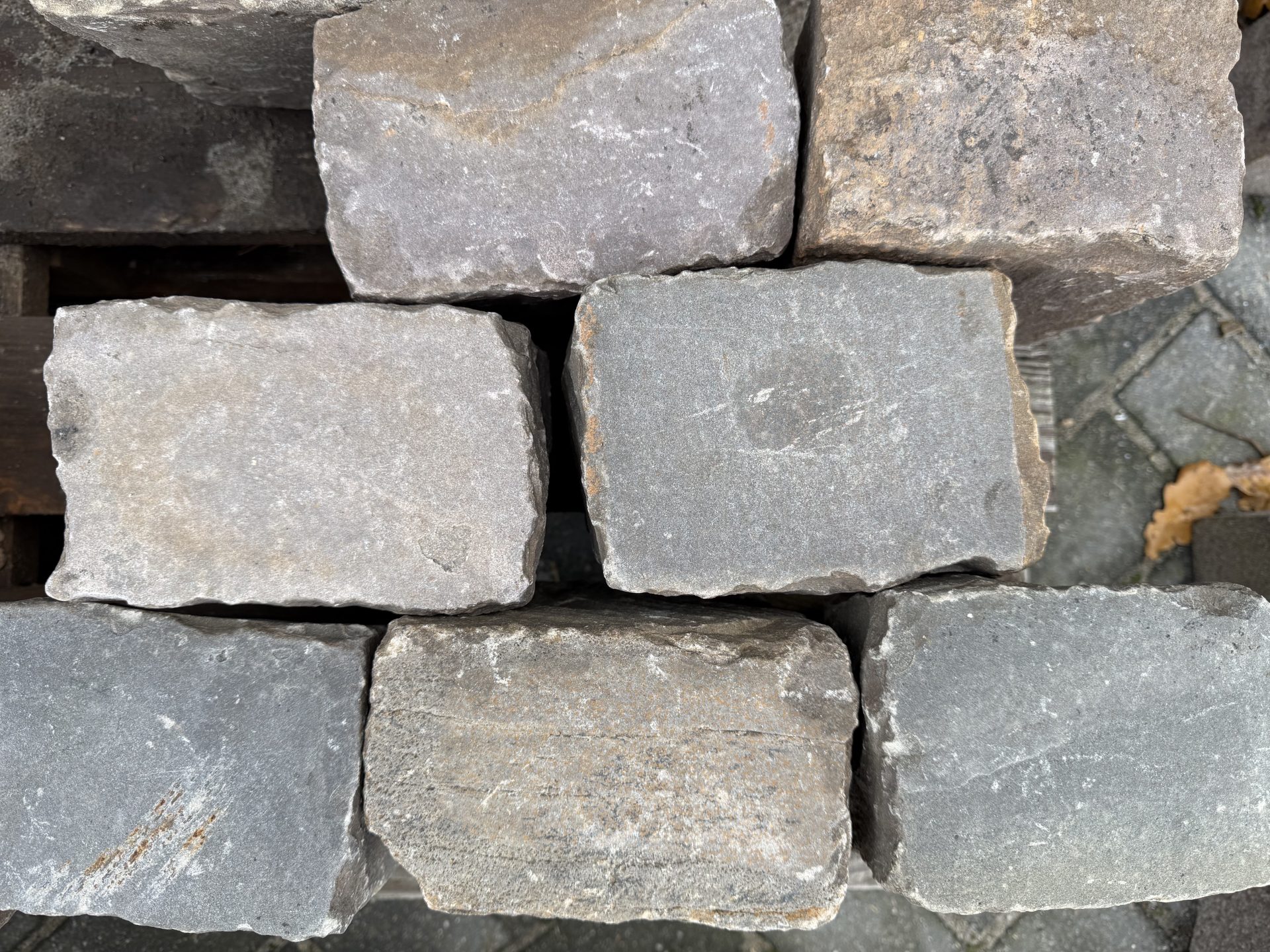 Het voordeel is wel dat ze door hun betrekkelijke hardheid zeer gevoelig zijn geweest voor al het verkeer wat er sinds die tijd overheen is geraast, de keien zijn vaak zo glad/egaal als een biljartlaken door hun gevoelige slijtlaag. En de prachtige diepgrijze kleur komt dan helemaal tot uiting, het is een zeer zeldzaam product waarvan nog maar weinig van op de markt komt, er wordt nog wel geprobeerd om de typische natuurlijke diepgrijze kleur en vorm na te bootsen met producten uit het verre oosten maar de echte authentieke keien zijn onvervalsbaar.